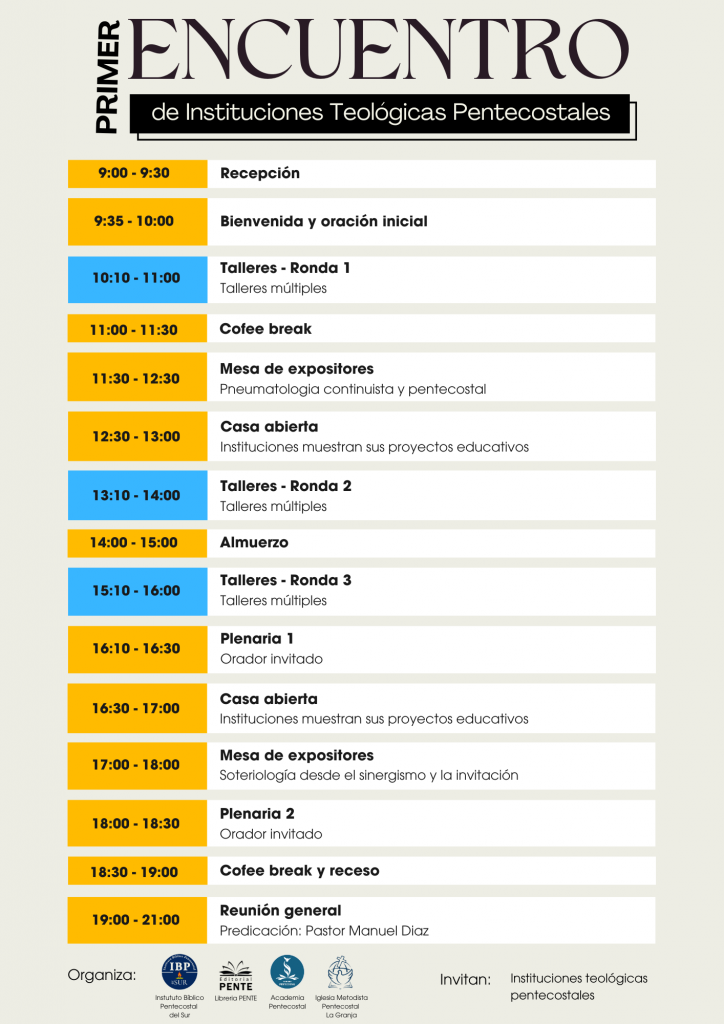 Hemos preparado un tiempo especial para que todos los que asistan a este encuentro  puedan participar en tres etapas de talleres que hemos distribuido para esta jornada. Todos los expositores son especialistas en los temas que darán, varios de ellos directores de sus respectivas instituciones teológicas.